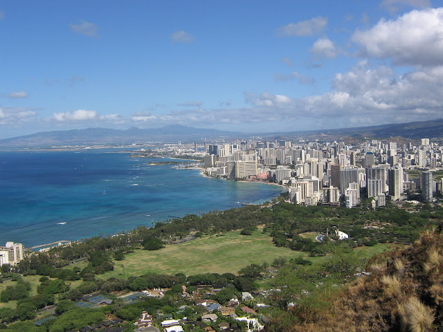 On the second full day, we hiked up Diamond Head. Which is a heck of a walk, at least for someone as out of shape as I sadly have become. First, you follow an incredibly steep path until your thighs ache, then you climb an even more steep (and approximately infinite) set of stairs, then you trudge upward some more, then there are more stairs, and finally you have to crawl through a cramped old WWI bunker. But when you get to the top, you're rewarded by views spectacular enough to make every step worth it:
